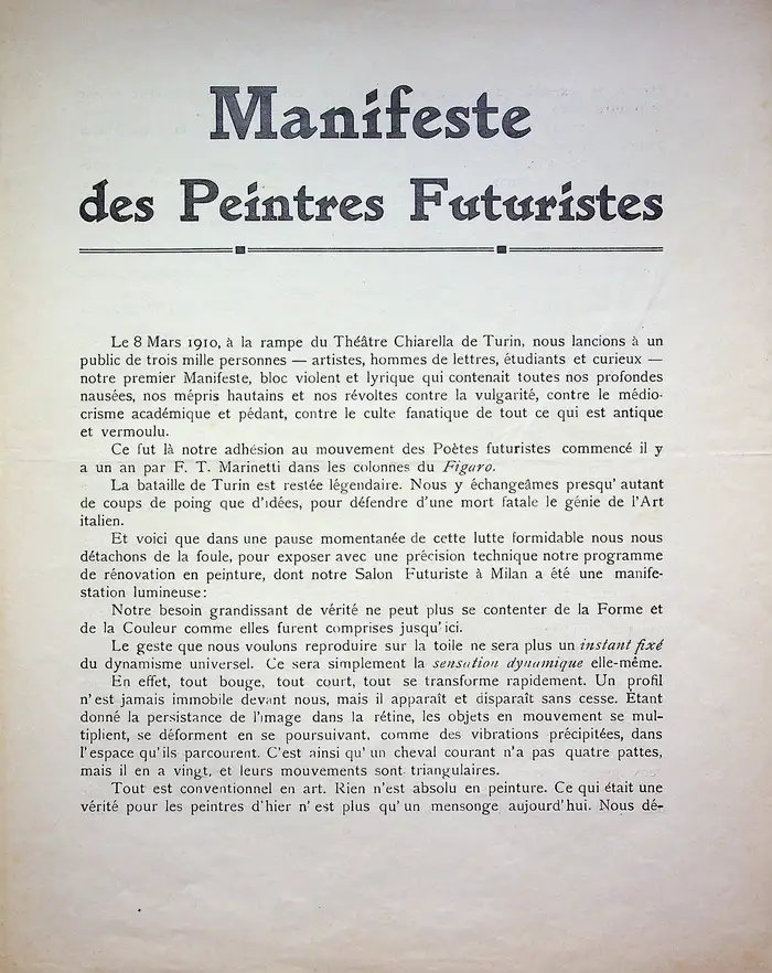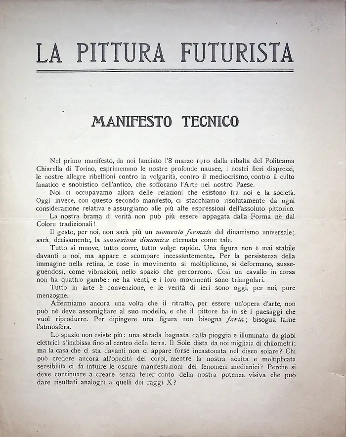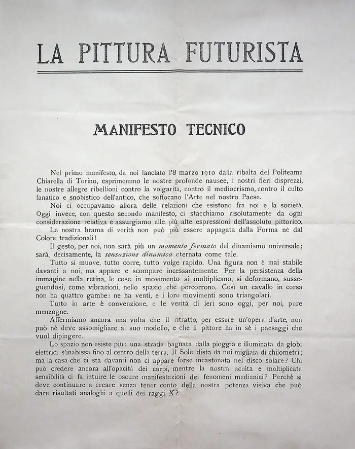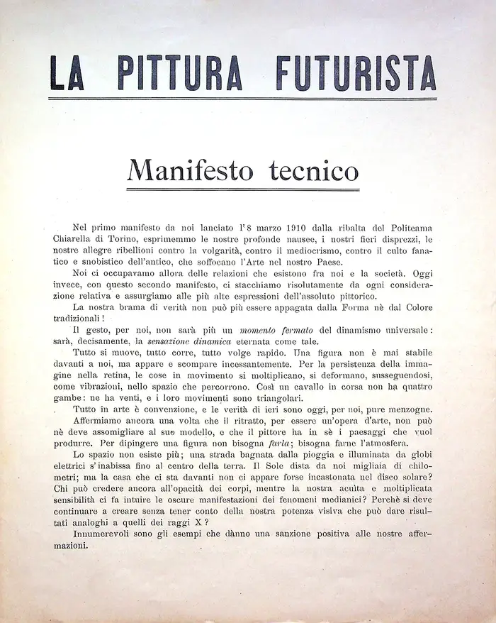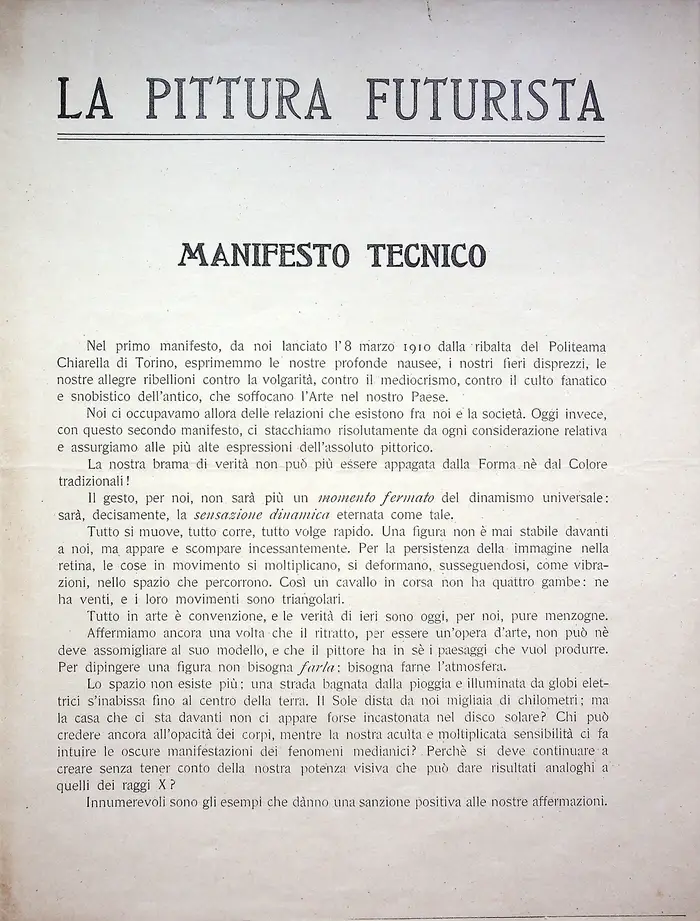 Manifesti fondativi, rottura col passato, velocità, dinamismo, rivoluzione tipografica.