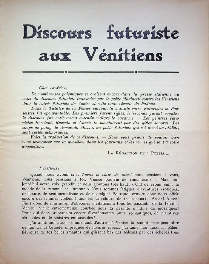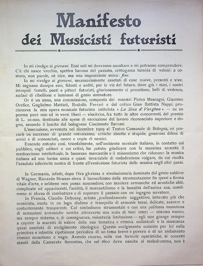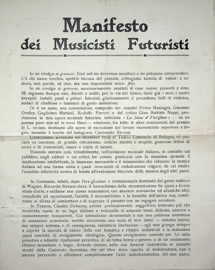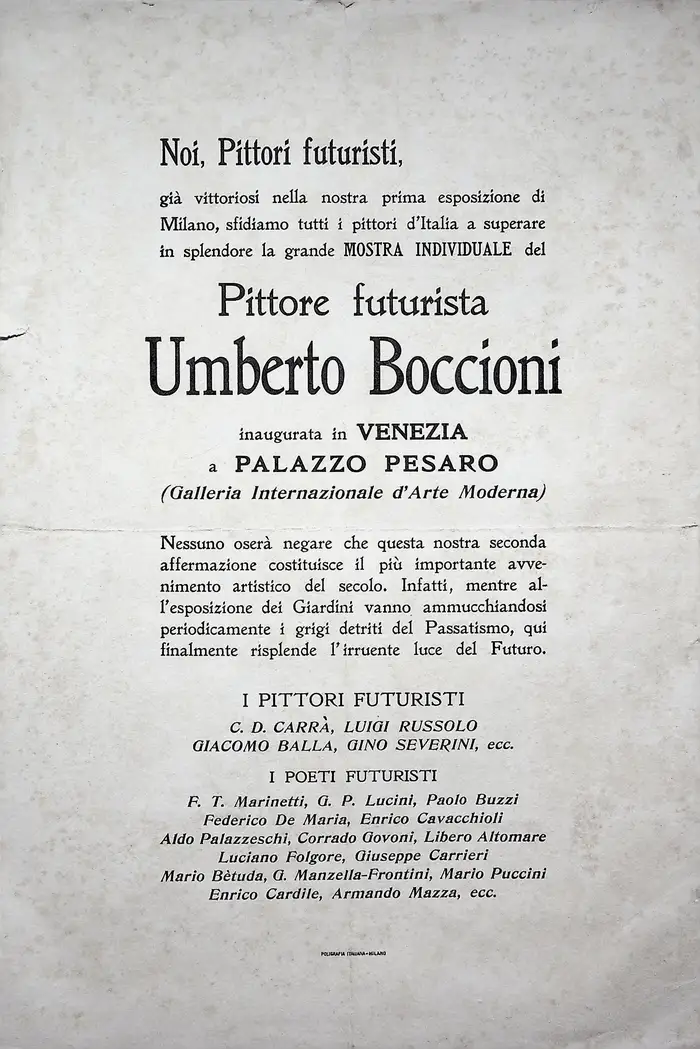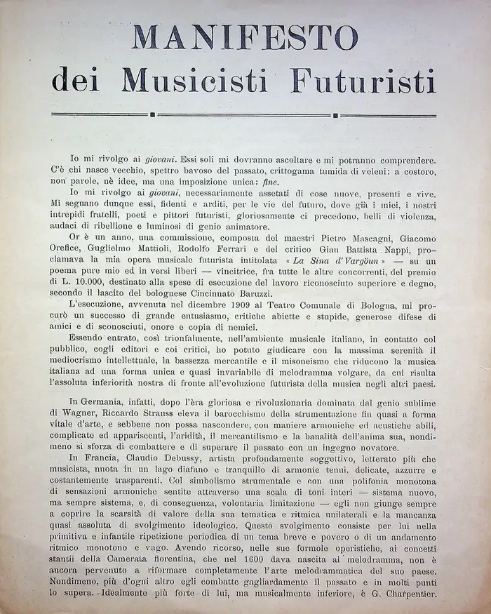 Manifesti fondativi, rottura col passato, velocità, dinamismo, rivoluzione tipografica.