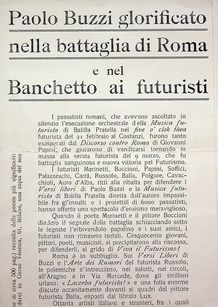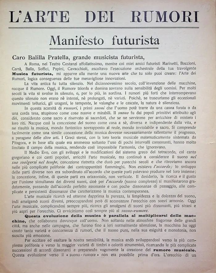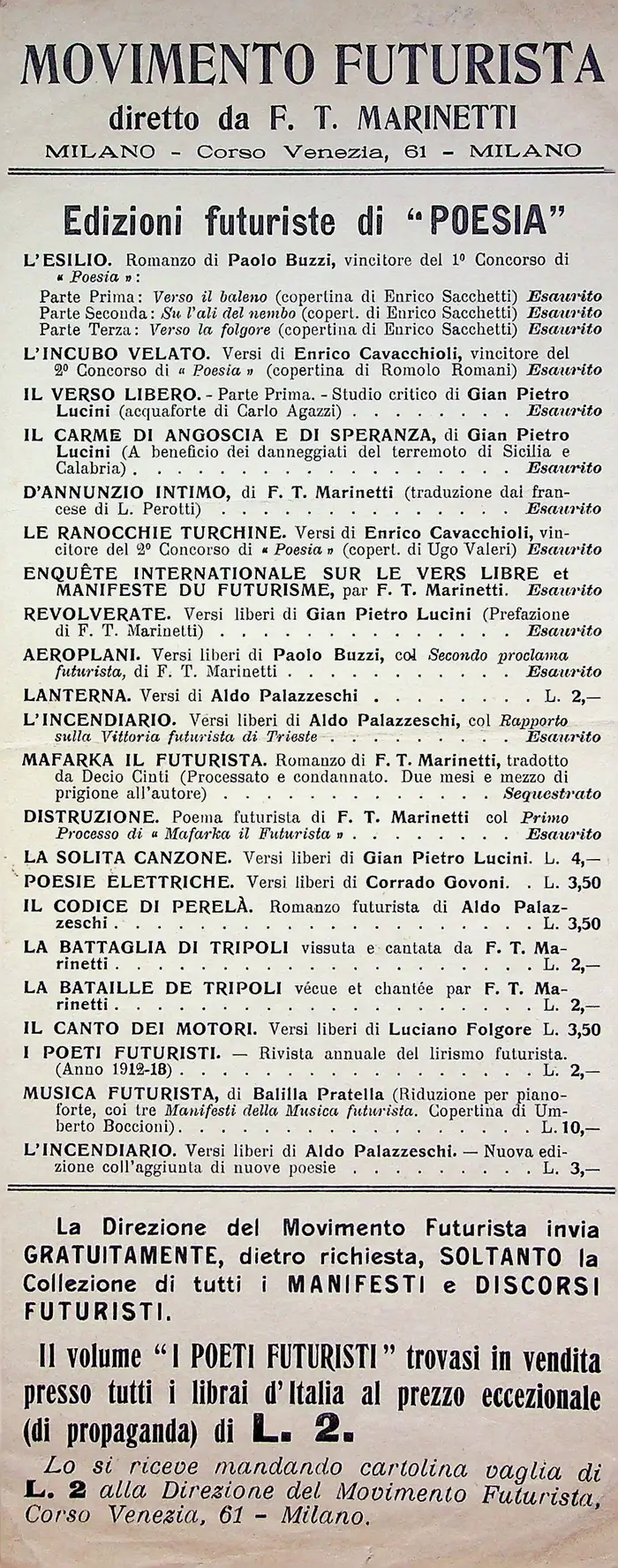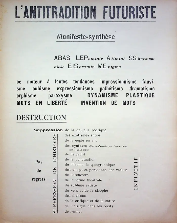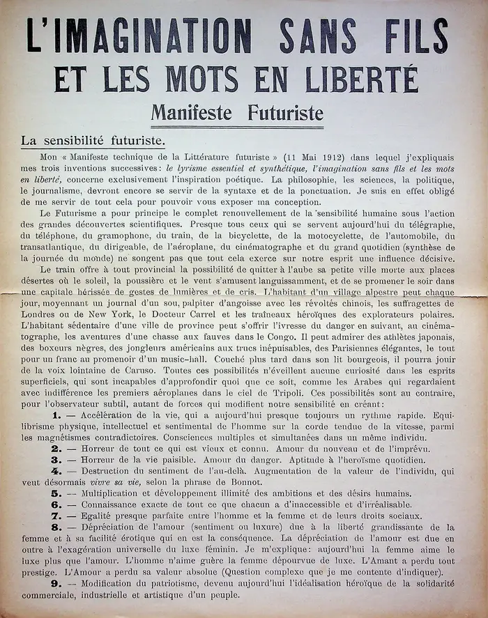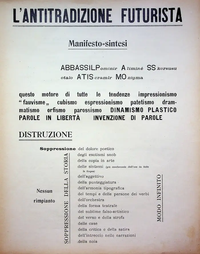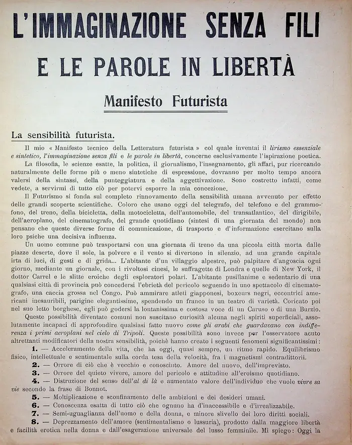 Manifesti fondativi, rottura col passato, velocità, dinamismo, rivoluzione tipografica.