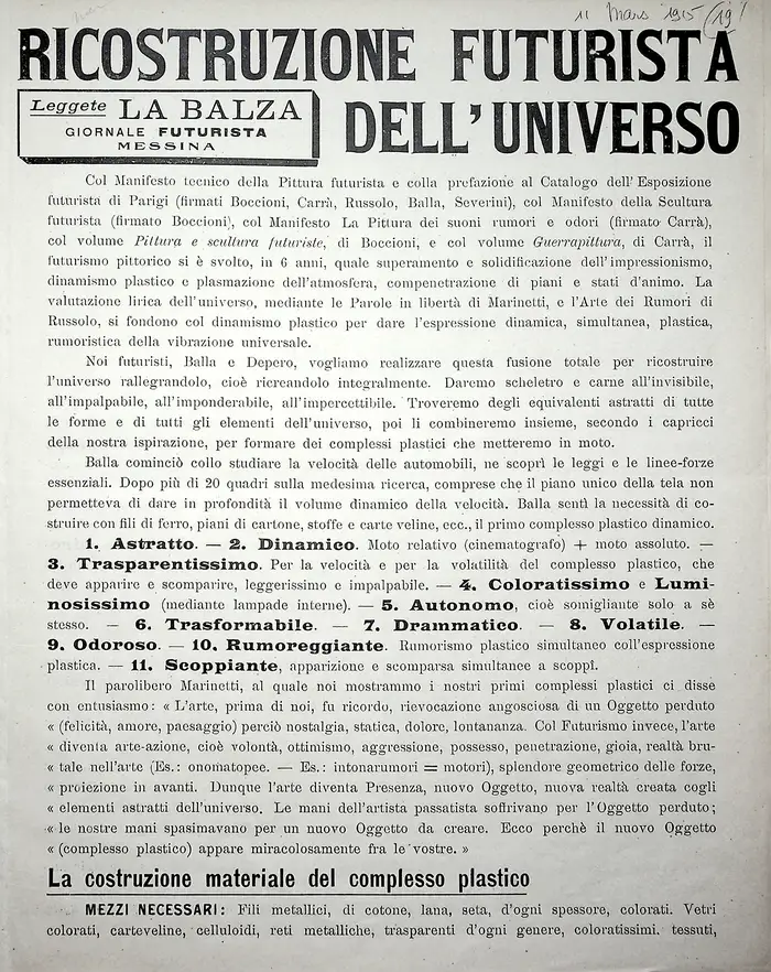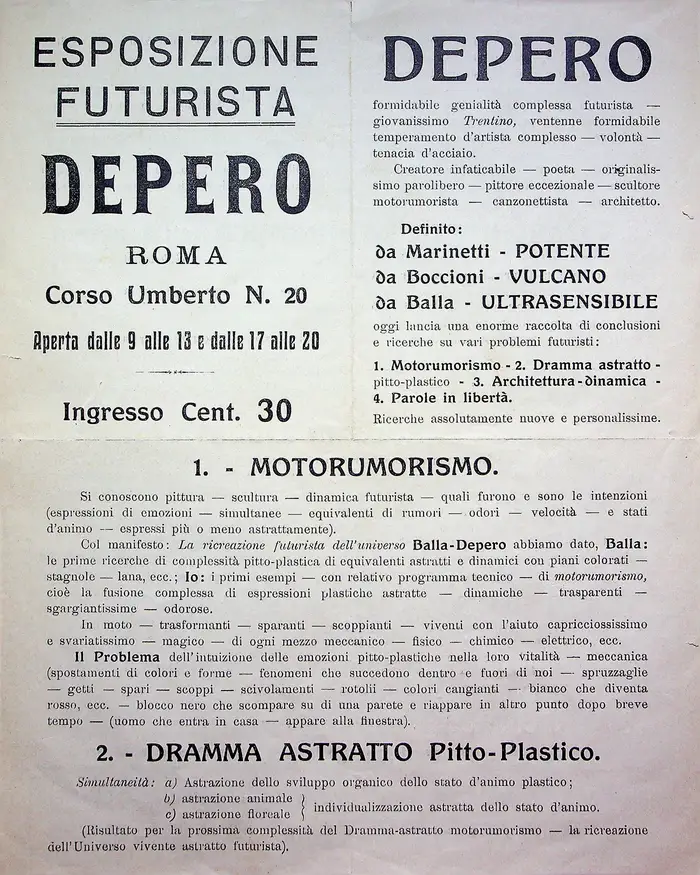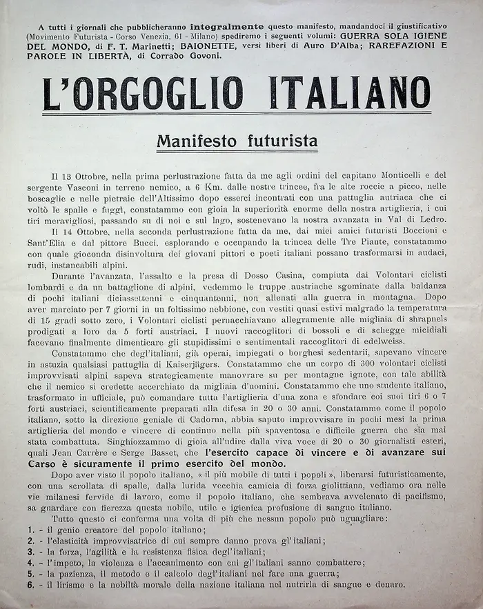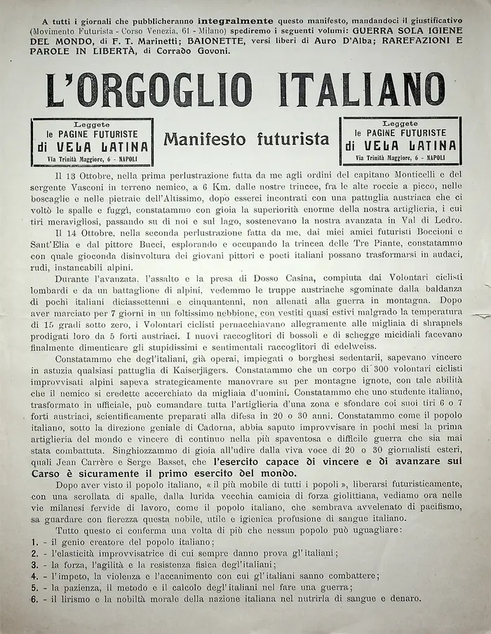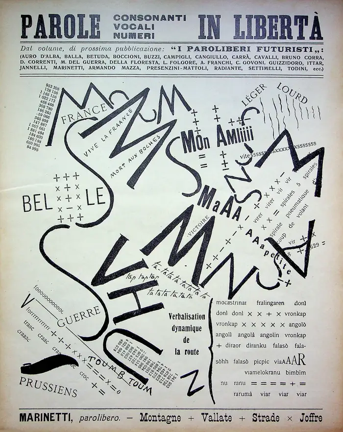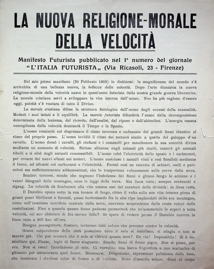 Manifesti fondativi, rottura col passato, velocità, dinamismo, rivoluzione tipografica.